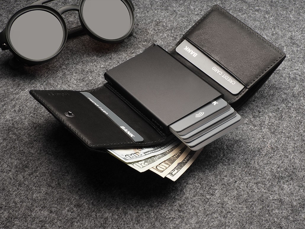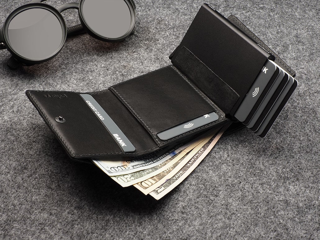 Przechowa wiele kart płatniczych i dokumentów. Specjalny mechanizm stopniowego wysuwania kart -zapewnia do nich szybki i łatwy dostęp. Elegancka funkcjonalność tego portfela to również dodatkowa, obszerna kieszeń na banknoty oraz klapka zapinana na zatrzask. Dzięki zastosowanej w jego konstrukcji technologii blokowania RFID, Twoje wrażliwe dane oraz środki na kartach płatniczych są całkowicie bezpieczne i chronione przed nieautoryzowanym skanowaniem lub kradzieżą.