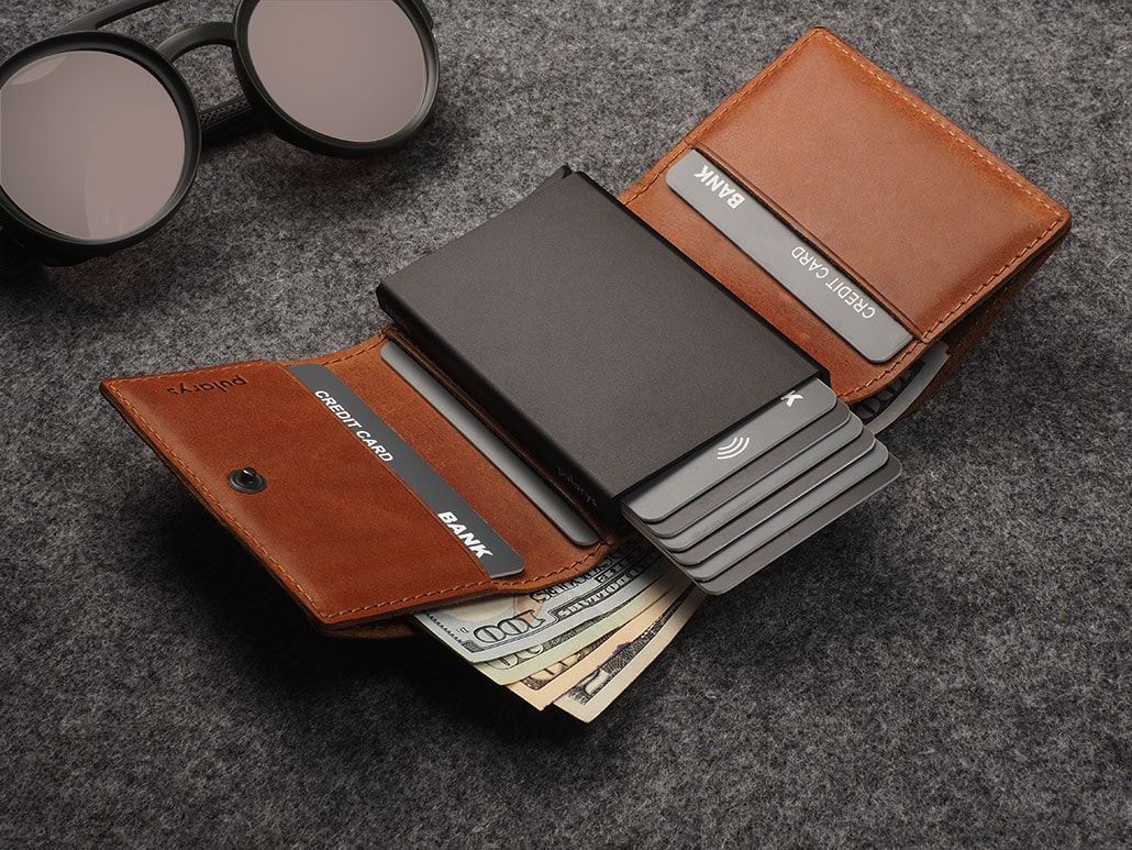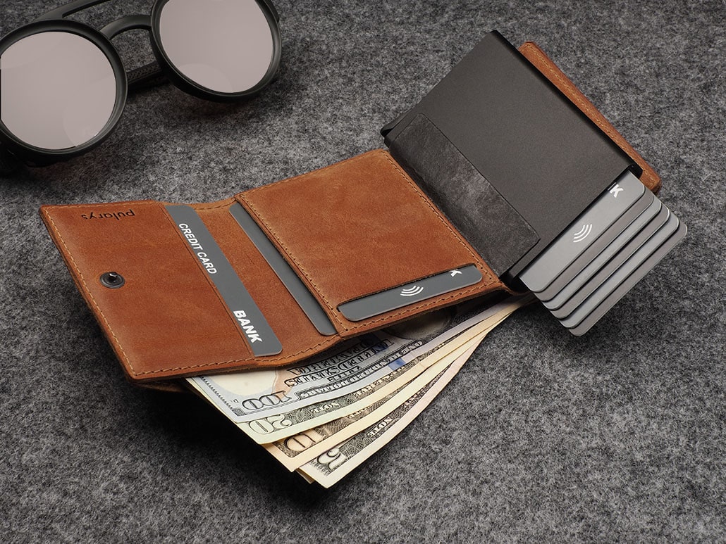 Va stoca multe carduri de plată și documente. Mecanismul special de ejectare treptată a cardurilor - asigură accesul rapid și ușor la acestea. Funcționalitatea elegantă a acestui portofel include, de asemenea, un buzunar suplimentar, spațios, pentru bancnote și o clapă cu închidere prin clic. Datorită tehnologiei de blocare RFID utilizată în designul său, datele dvs. sensibile și fondurile cardurilor de credit sunt complet sigure și protejate împotriva scanării neautorizate sau a furtului.